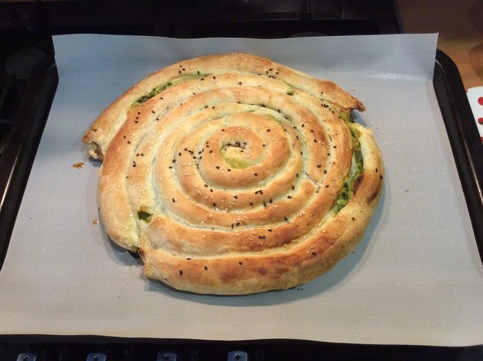 Отправляем в заранее разогретую до 200°C духовку на 30 минут, потом еще на 10 минут при 180°C. Время выпекания корректируйте в зависимости от вашей духовки. Когда пирог подрумянится, он готов.