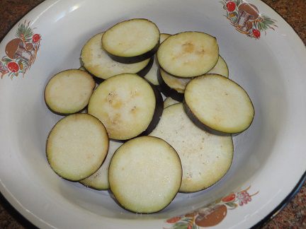 Нарезаем помидоры (крупненькие) нарезаем кружочками, а небольшую луковицу тоненькими кольцами. Оливки тоже нарезаем. Баклажаны промываем водой и слегка отжимаем.