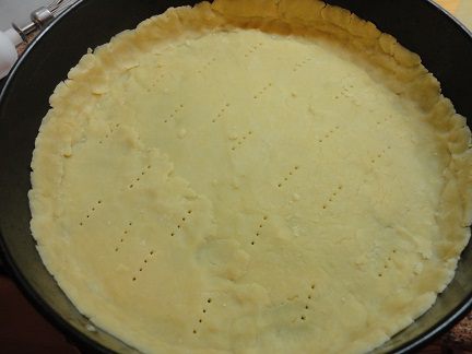 Готовое тесто выложить в форму диаметром 28 см ( но в следующий раз я буду готовить его в форме диаметром 24 см), формируя бортики. Наколоть тесто вилкой и поставить в холодильник.