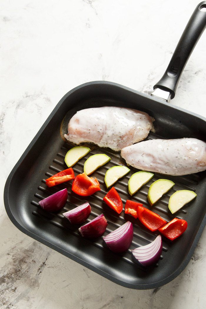 Красный лук, кабачки и болгарский перец нарезать. Достать из холодильника курицу. Выложить курицу и подготовленные овощи на гриль, обжарить до готовности.