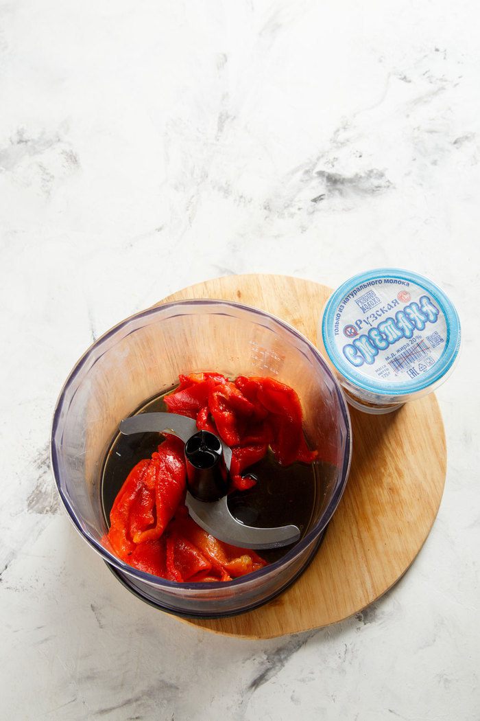 Затем аккуратно открыть, очистить перцы, удалить семена. Мякоть сложить в блендер, добавить сметану. Взбить, приправить солью и перцем.