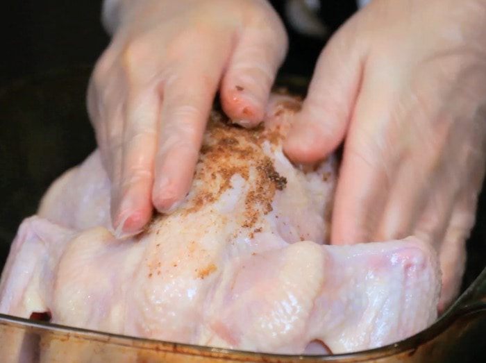Смешать оливковое масло с перцем, солью, 5 специями и кориандром. Натереть этой смесью курицу со всех сторон. Запекать в духовке 1 час.