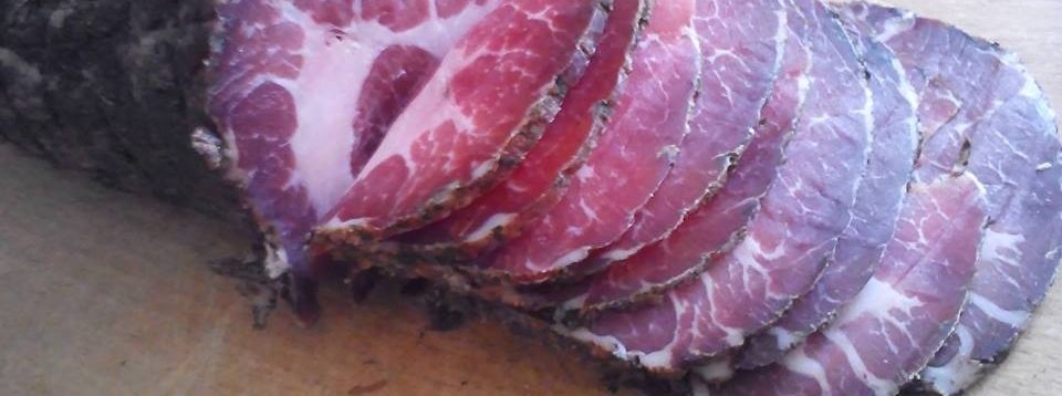 Краткое описание: Коппа ди парма (итал. "мясо из Пармы") сделана из свиного ошейка. Для исключения возможных вопросов по аллергическим реакциям привожу список использованных специй: мускатный орех черный перец; перец чили; лавровый лист; орегано; Срок хранения при температуре от 0 до +5 до 6 месяцев. В холоде без вакуума - до 3-х месяцев. Для избежания обезвоживания хранить в закрытой посуде.