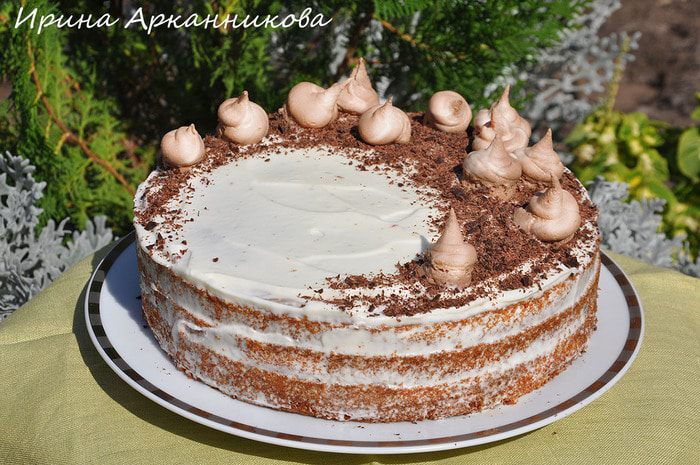 Бисквит разрезать после остывания на 3 части по горизонтали. Каждый корж намазать кремом. Бока-тоже. Широким ножом убрать лишний крем с боков. Верх посыпать тертым шоколадом и украсить безе.