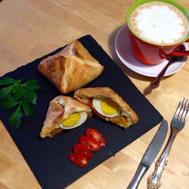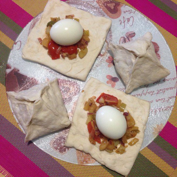 На кусочки теста выложить обжаренные овощи и яйца вкрутую и защепить.
