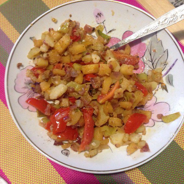 Обжарить овощи (любые какие вам нравятся) на сковородке на оливковом масле и приправить специями по вкусу.