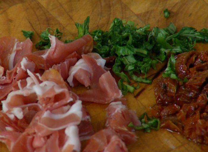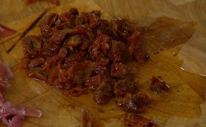 Вяленые помидоры нарезать.