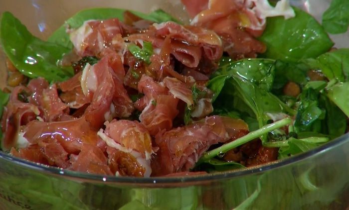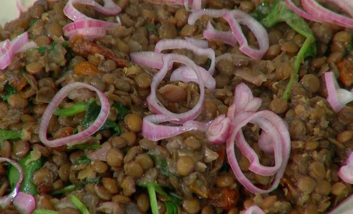 Теплый салат из чечевицы с ветчиной и вялеными помидорами