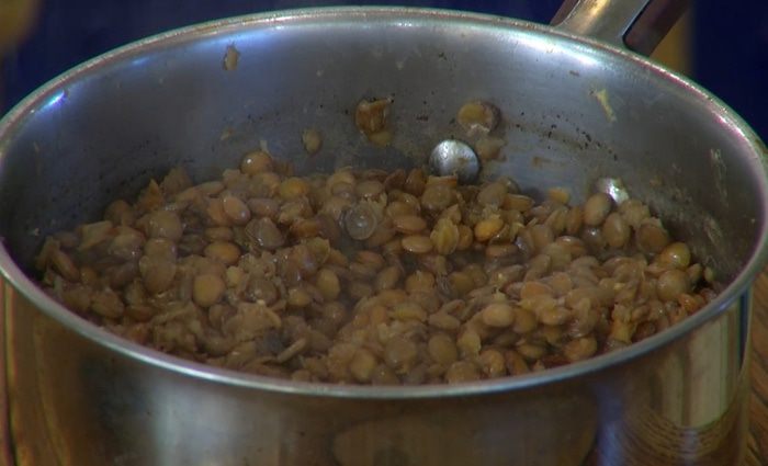 Бульон влить в кастрюлю и разогреть, всыпать в него чечевицу и отварить до готовности.