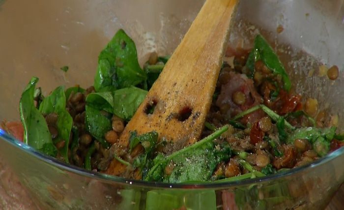 Горячую чечевицу выложить в глубокое блюдо, добавить шпинат и перемешать.