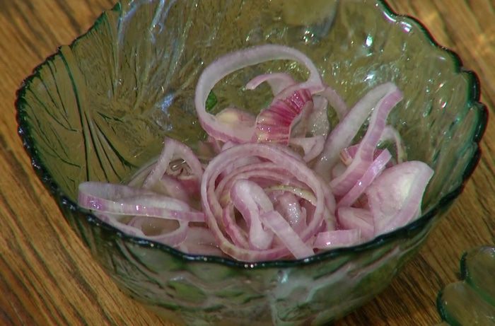 Залить нарезанный лук уксусом и дать ему замариноваться.