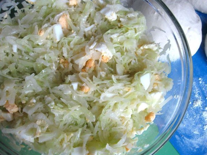 Яйца отварить вкрутую (положить в холодную воду и варить 10 минут с момента закипания). После снятия с огня залить холодной водой. Очистить от скорлупы, нарезать. Масло для начинки растопить, капусту положить в кастрюлю, посолить, добавить сахар, масло, перемешать, снова положить на сито. Яйца лучше добавить непосредственно перед тем, как вы будете раскладывать начинку на тесто.