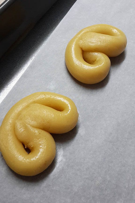 Сворачивать колбаску в форме кренделька и выкладывать на противень.
