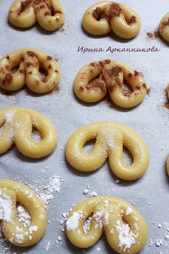 Посыпать крендельки сахаром, пудрой и корицей.