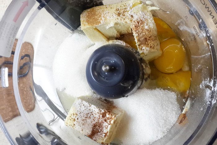 Взбить в блендере (с помощью насадки-ножа) яйцо, сахар, ванилин, охлажденное ( у меня в холодильнике температура +2 градуса) масло кусками. Просеять в массу разрыхлитель, корицу и муку.