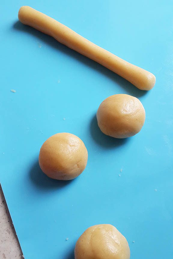 Разогреть духовку до 180°С. Противень застелить пергаментом. Отщипывать о теста кусочек, и скатывать из него шарик, затем из шарика колбаску.