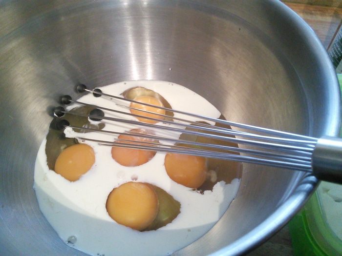 У меня порция омлета на троих с 5 крупными яйцами. И так: яйца взболтать со сливками, (соль используйте по вкусу, т. к. и фета и маслины слоёные!).