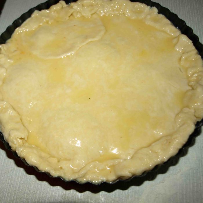 Из второй части теста раскатываем корж и накрываем форму. Края смазываем водой и соединяем два коржа вместе. Срезаем излишки теста. И отправляем в заранее разогретую духовку до 180 градусов примерно на 50 минут.