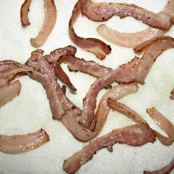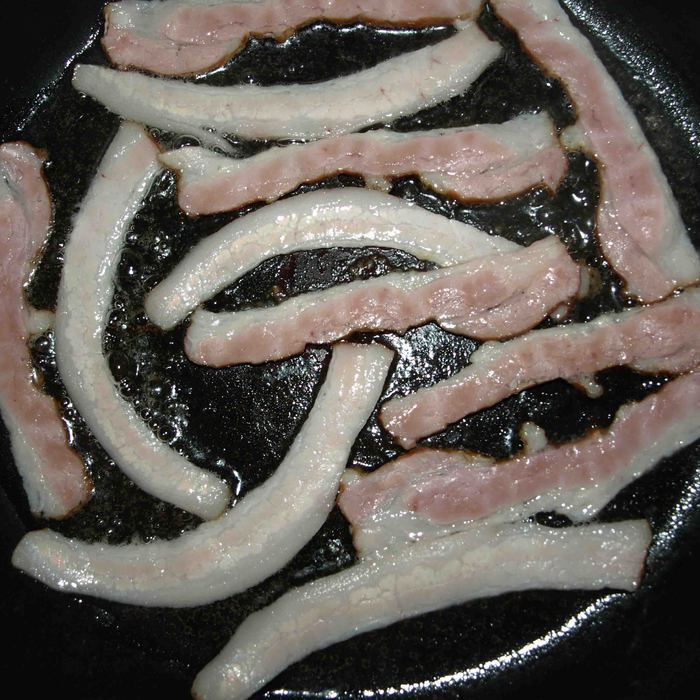 Ломтики бекона режем на две части вдоль. Масло разогреваем в сковороде и обжаривает бекон до золотистой корочки. Бекон можно заменить грудинкой.