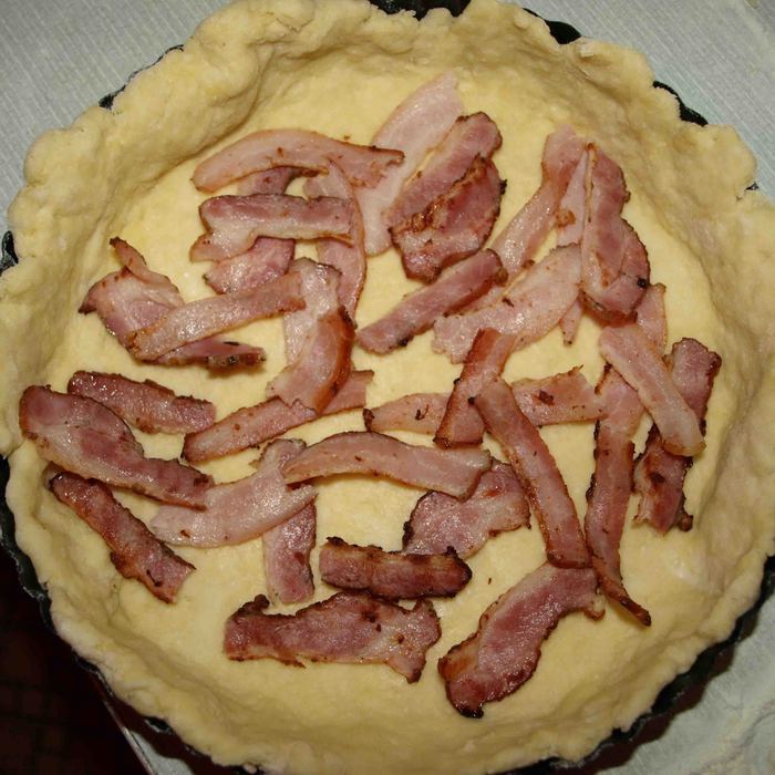 Большую часть теста раскатываем и укладываем в форму 20 см. Ломтики бекона рвем на кусочки и укладываем на тесто.