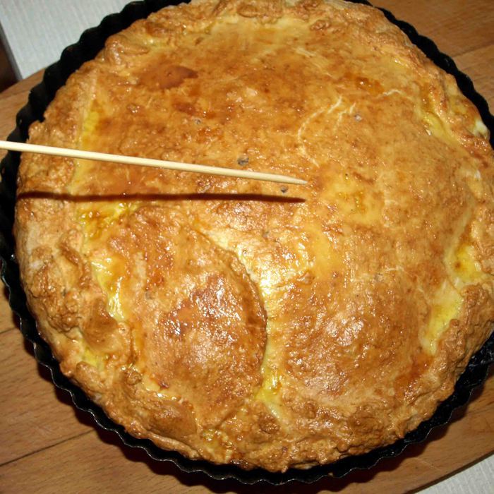Проверяем бамбуковой палочкой или острым ножом готовность пирога. Начинка должна загустеть, а пирог стать золотистым.