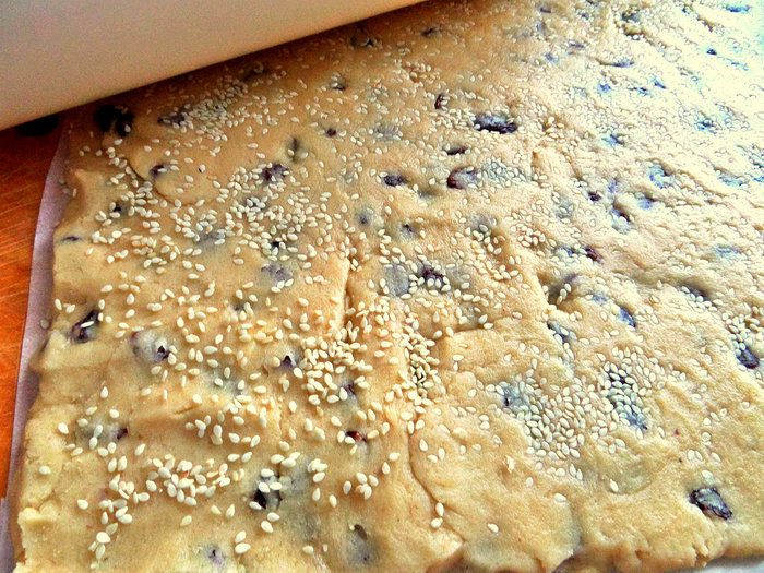 Замешиваем уже рукой крутое песочное тесто. Кунжут можно добавить прямо в тесто, а можно сделать так: шаг ниже.