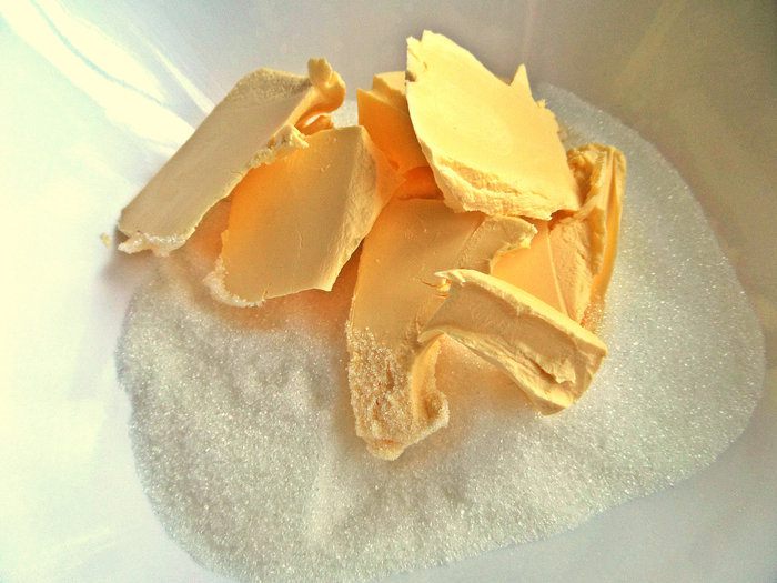 Мягкое масло или маргарин отправим в сахар с ванилью. Растираем ложкой.