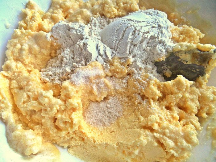 Добавим майонез. Всыпаем по частям муку с содой и продолжаем растирать.