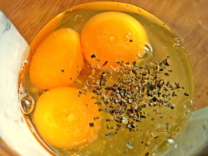 В емкость для взбивания или в 0,5 л банку вбиваем яйца, добавим базилик или другую зелень. Чеснок можно добавить, если не надо на работу.