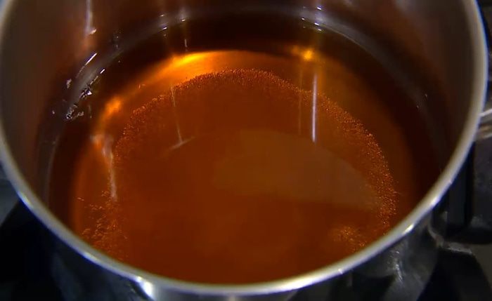 Сахар всыпать в кастрюлю, добавить глюкозу, влить 270 мл теплой воды и на медленном огне сварить сироп.