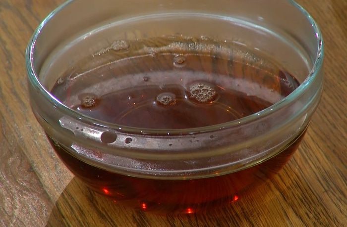 В сметану, непрерывно вымешивая, влить порциями большую часть остывшего сиропа, если понадобится — добавить еще немного сиропа.