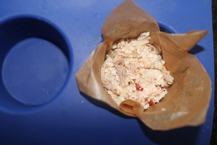 Берем форму для кексов. Формочки рекомендую проложить пекарской бумагой. Я попробовала и с бумагой, и без. С бумагой удобнее. Выкладываем начинку из курицы в формочки и приминаем.