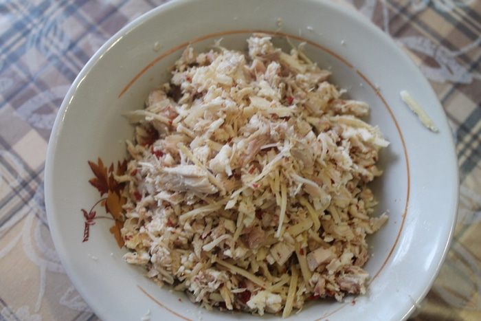Курицу, взяла ту что осталась от бульона. Сыр, который был в холодильнике — моцарелла и "Российский". Предлагаю позавтракать.