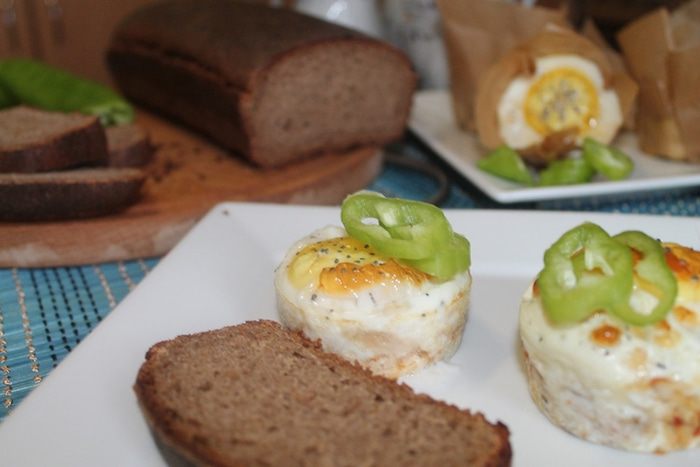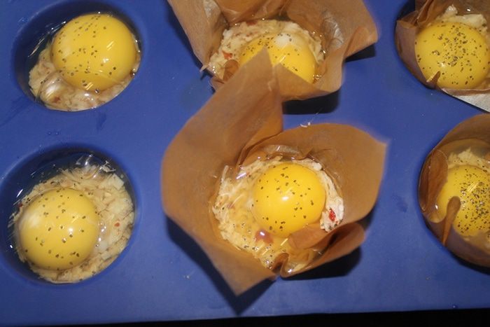 Запекаем примерно 15-20 минут. Все зависит от того, какой степени "зажарки" желток вам вкуснее. Я держала в духовке 20 минут. Те кексики которые были в бумаге получились с жидким желтком, а которые без бумаги у них желток сварился полностью.