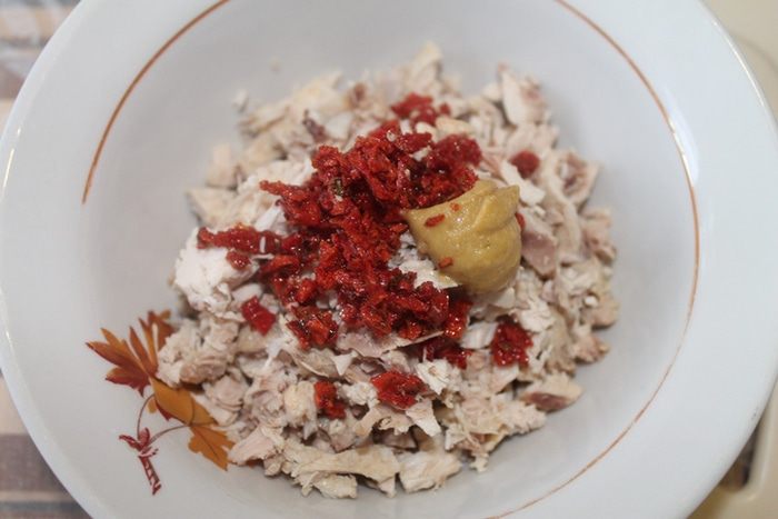 Включить духовку на 180 градусов. Курицу мелко порезать, добавить измельченные помидоры (2 столовые ложки), горчицу, и натертый сыр. Если надо посолите и поперчите по вкусу.