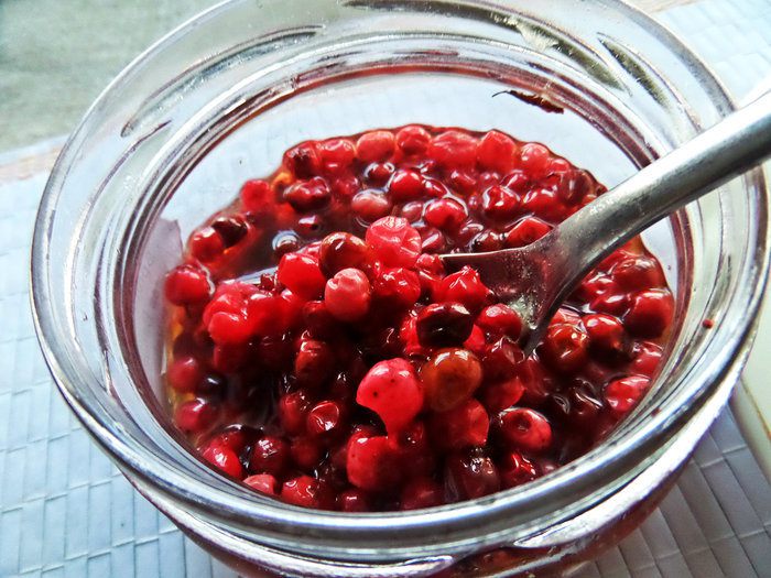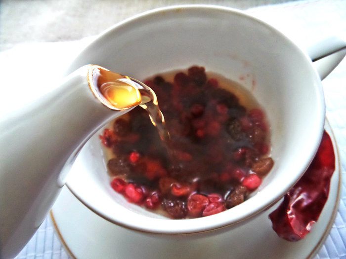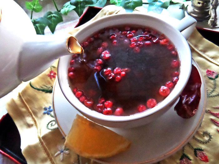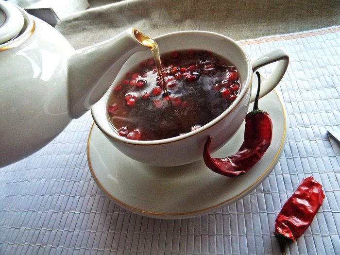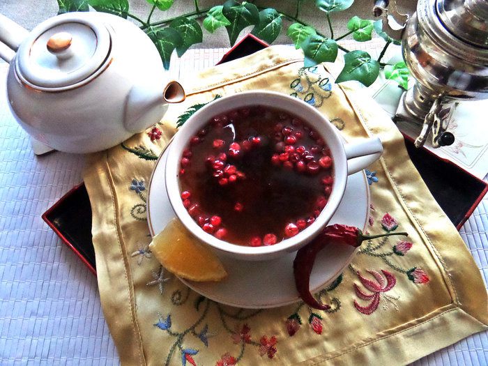 За окном у нас дождь, не хватает красок и тепла. Придумала себе такой чай: кислинка от брусники, сладость от изюма, пикантность от чили, всё вместе — самодостаточный чаёк, который не требует дополнений в виде шоколадки и пр.
