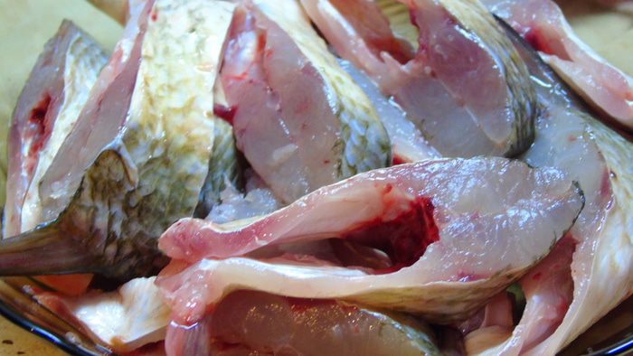 Рыбу очистить, вымыть, дать стечь. Нарезать кусочками, как нравиться, у меня не сильно крупный лещ, но как говорят "даренному коню в зубы не смотрят", если лещ покрупнее, то можно кусочки помельче.