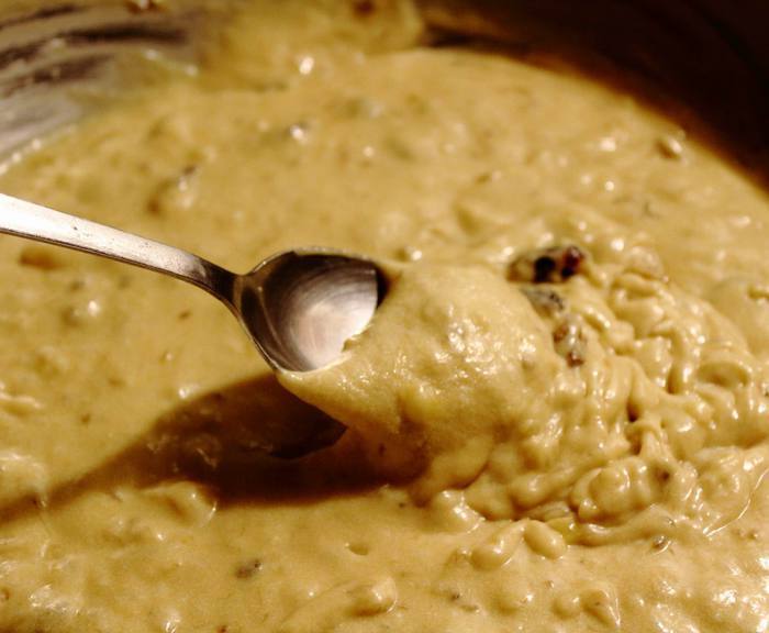 Бананы размять вилкой в пюре. Можно в блендере. Вмешать банановое пюре в основное тесто. Всыпать туда сухофрукты, я беру клюкву вяленую, иногда цукаты, иногда изюм. Не замачиваю перед использованием.