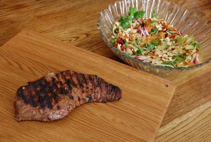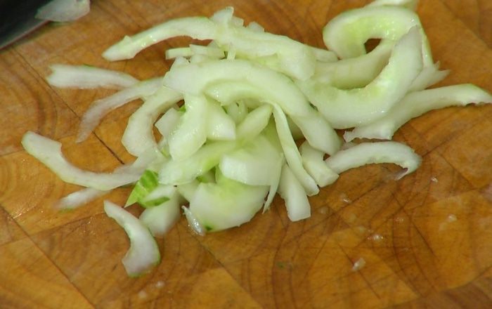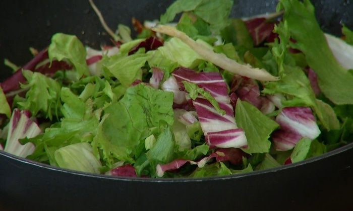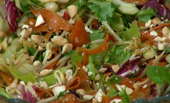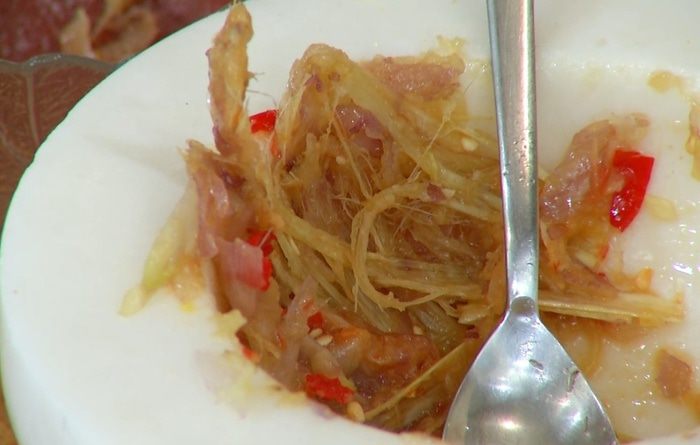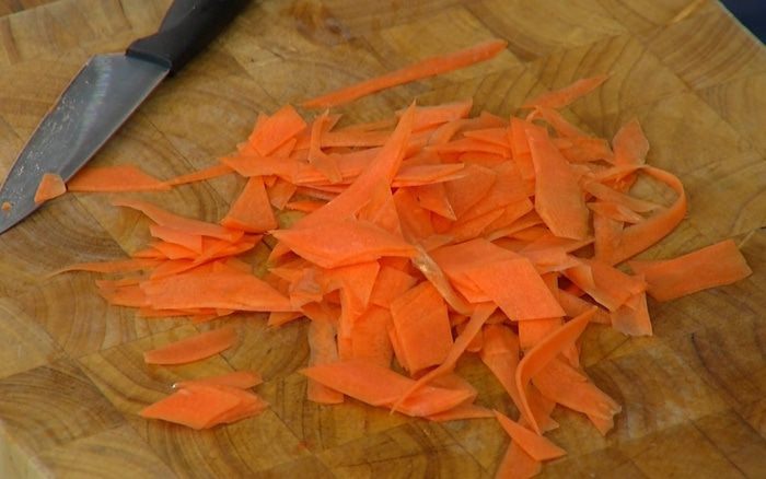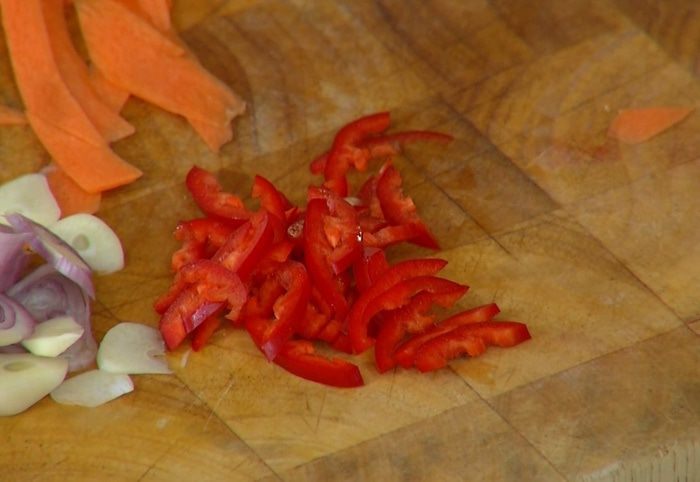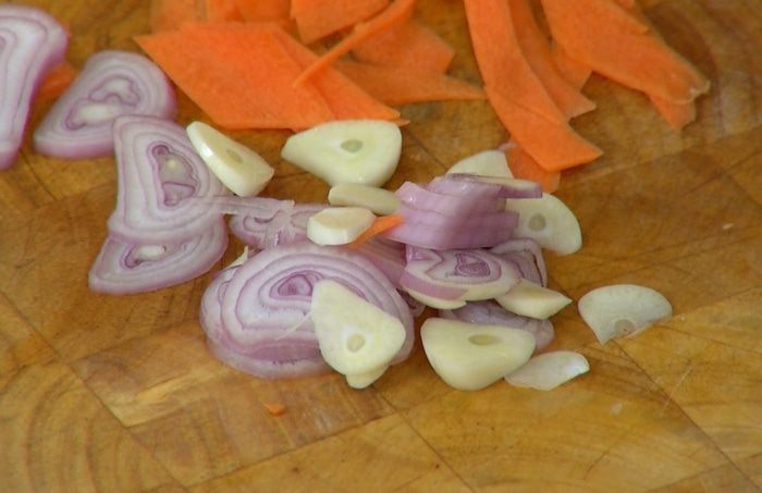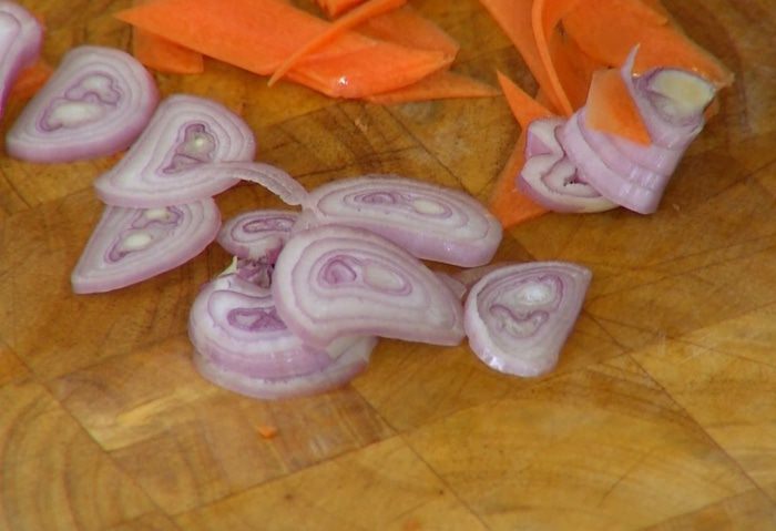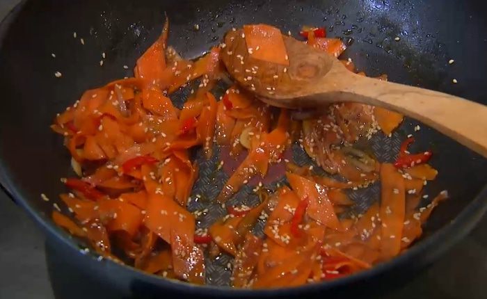 Разогреть в сковороде-вок оливковое и кунжутное масло и обжарить шалот, чеснок и перец чили. Добавить морковь, всыпать кунжут, все перемешать и немного обжарить, затем влить соевый соус, все перемешать и еще немного обжарить. Снять вок с огня, влить оставшийся рыбный соус и еще раз все перемешать.