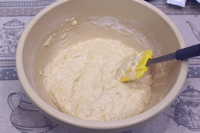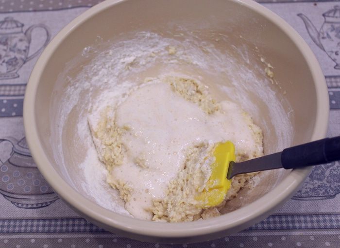 Перемешать. Возможно понадобиться еще немного муки, в зависимости от густоты кефира. Тесто должно получиться как густая сметана.