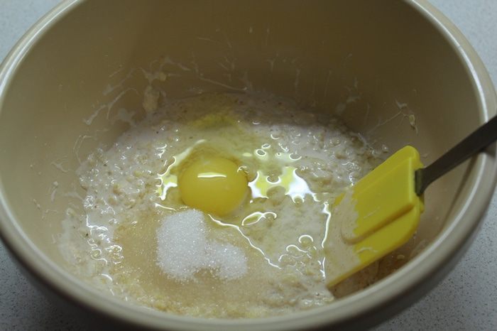 Добавить яйцо, сахар, соль.