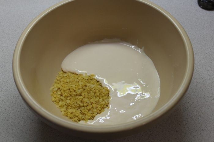 Хлопья пшенные залить теплым кефиром (или слегка нагреть в микроволновой печи вместе с хлопьями). 1/4 часть кефира оставить в стакане, отставить в сторону. Перемешать хлопья, дать немного постоять.