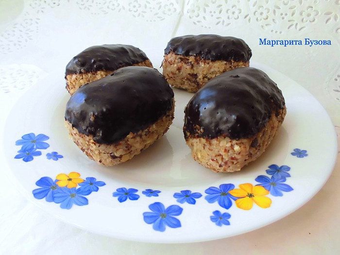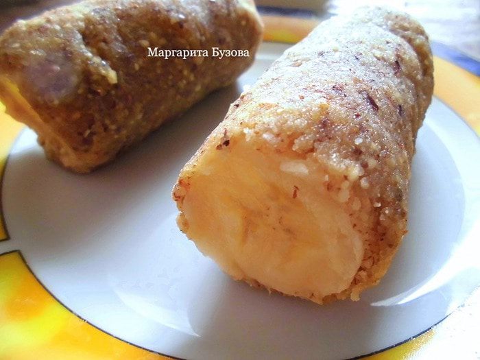 Банан очистить от кожуры, обрезать попки, и разрезать его на несколько частей, в зависимости от того, какого размера пирожные Вы хотите получить. Смазать бананы лимонным соком. Я это делаю по двум причинам: для того, чтобы бананы не потемнели, и, чтобы эклеры в готовом виде были в меру сладкими. Облепить бананы ореховой массой со всех сторон. По желанию, места срезов можно оставить открытыми.