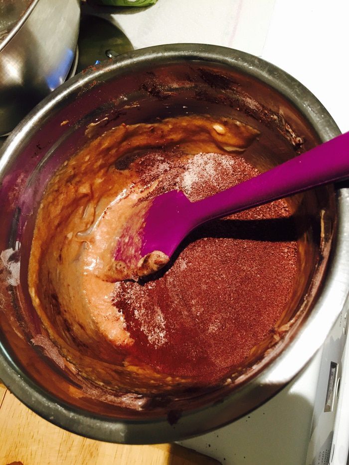 Просеиваем туда сухие ингредиенты, вымешиваем.