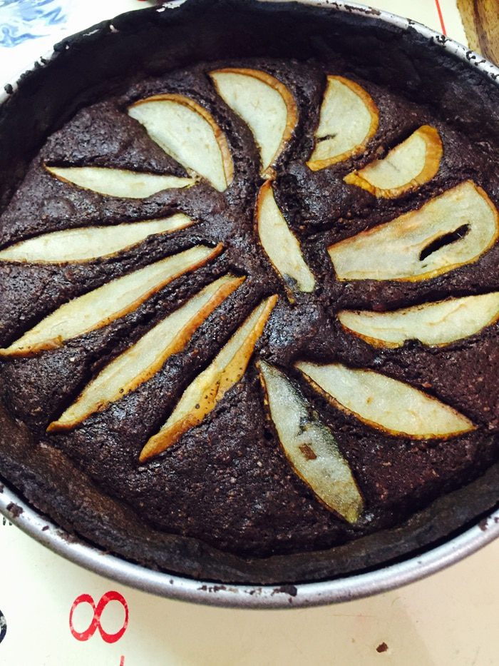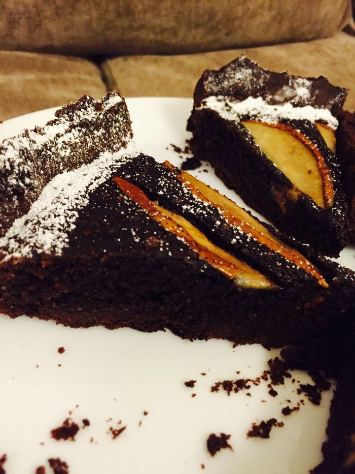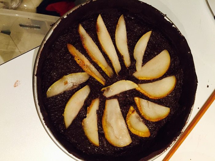 Теперь нарезаем груши тонкими дольками (у меня одна очень спелая) можно и другие фрукты/ягоды. Хорошо сочетающиеся с шоколадом — вишня или малина.