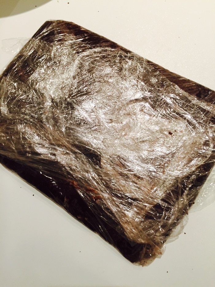 Тесто "упаковываем" в пленку. Я сразу отрезаю большой кусок, чтобы можно было потом в этой пленке и раскатывать. Трамбуем и в холодильник.