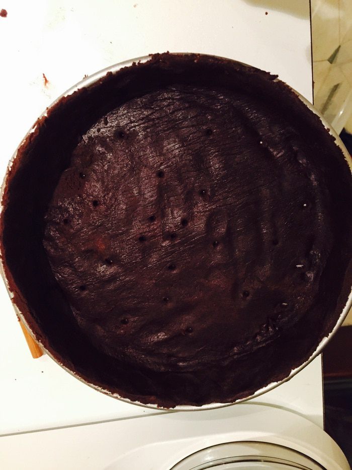 Разогреваем духовку до 190°С. Достаем тесто, раскатываем между пленкой, переносим в форму, утрамбовываем, излишки срезаем, прокалываем в нескольких местах.