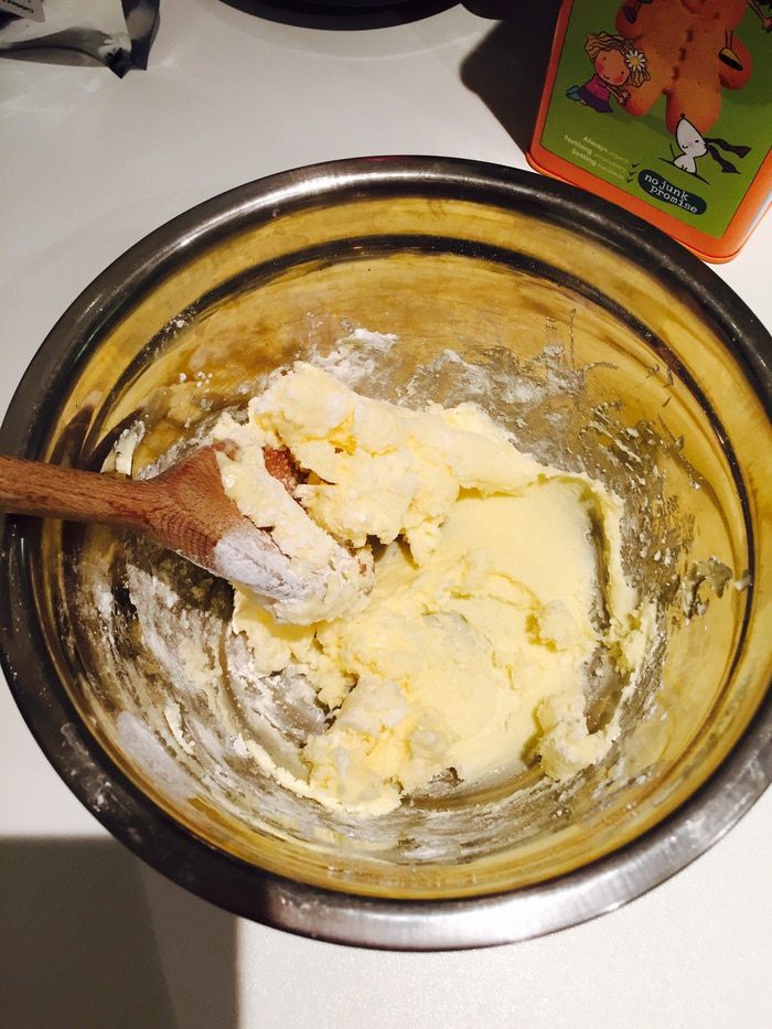 Для теста лопаточкой разминаем сливочное масло. Добавляем сахарную пудру (просеянную), хорошенько мешаем до объединения.