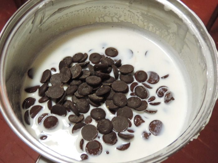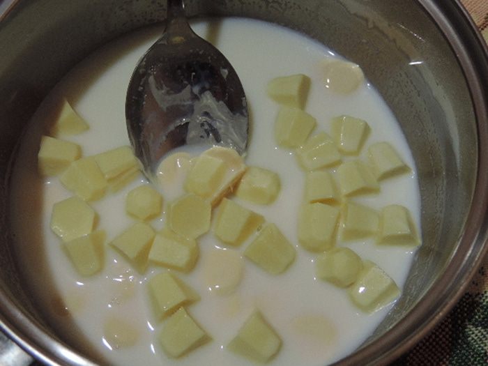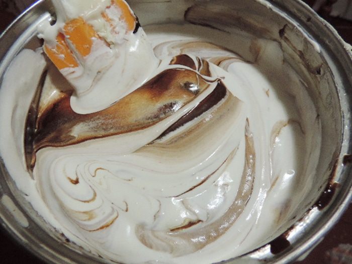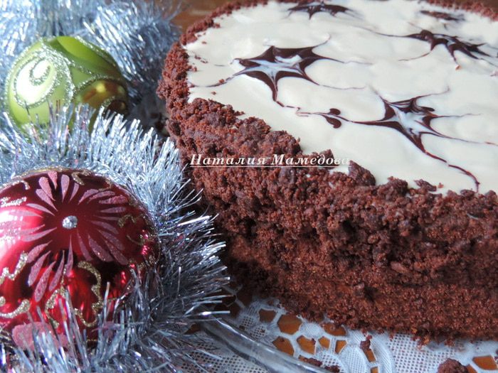 Мне захотелось торт украсить дополнительно. Верх торта я покрыла белой глазурью. Для ее приготовления растопить белый шоколад со сливочным маслом и молоком, дать остыть до комнатной температуры и вылить на верх торта. По белой глазури я нарисовала разводы растопленным черным шоколадом с добавлением небольшого количества рафинированного растительного масла. Бока торта обсыпала трюфельной крошкой (можно взять вафли, печенье, бисквитную крошку, орехи, — все, что будет под рукой и покажется уместным).