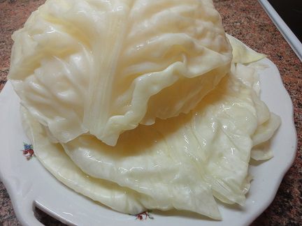 Кочан капусты надрежьте у кочерыжки, опустите в кипящую воду — он будет хорошо разбираться на листья. Листья надо подержать в горячей, почти или совсем кипящей воде 5 минут. Вынуть, остудить, срезать утолщения.